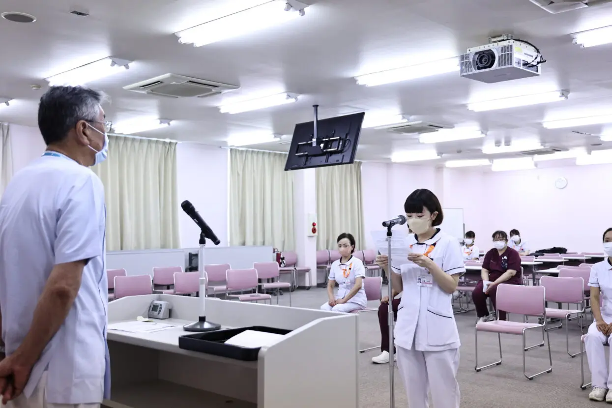 入講式では2023年度の入講生3名の紹介があり、院長の田内からは「特定行為研修を修了した看護師が活躍できる場をしっかり作り、有用に活用できる仕組みを作っていきたい。」と入講生に言葉がありました。