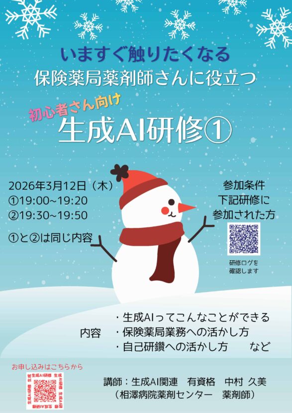 いますぐ触りたくなる 保険薬局さんに役立つ 初心者さん向け 生成AI研修① 詳細・お申し込みはこちら miyazawa_pr2026-02-24T14:49:18+09:002026年02月24日|保険薬局の方へ, 医療関係者向け, 薬剤師, 薬薬連携| FacebookTwitter電子メール