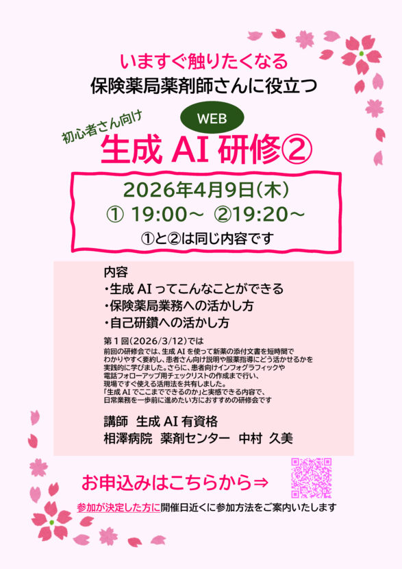 いますぐ触りたくなる 保険薬局さんに役立つ 初心者さん向け 生成AI研修 詳細・お申し込みはこちら miyazawa_pr2026-03-16T18:33:46+09:002026年03月16日|保険薬局の方へ, 医療関係者向け, 薬剤師, 薬薬連携| FacebookTwitter電子メール