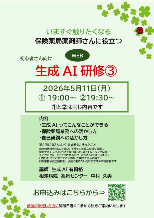 いますぐ触りたくなる 保険薬局さんに役立つ 初心者さん向け 生成AI研修 詳細・お申し込みはこちら miyazawa_pr2026-04-17T09:29:03+09:002026年04月17日|保険薬局の方へ, 医療関係者向け, 薬剤師, 薬薬連携| FacebookTwitter電子メール