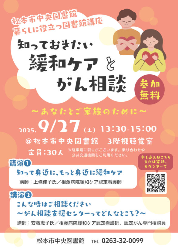 松本市中央図書館主催「暮らしに役立つ図書館講座」のご案内 松本市中央図書館主催「暮らしに役立つ図書館講座」で、「緩和ケア」と「がん相談」について講演します。ご興味のある方は、ぜひお立ち寄りください。 詳しくはこちら(松本市中央図書館) miyazawa_pr2025-09-03T15:25:06+09:002025年09月03日|お知らせ, 一般の方向け| FacebookTwitter電子メール
