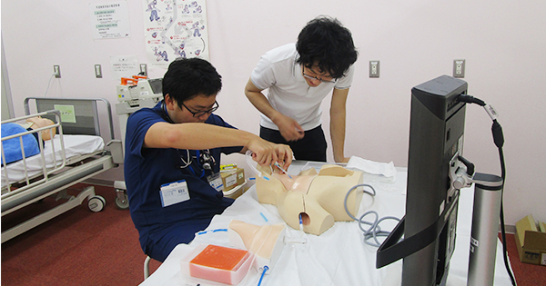 シミュレーターを利用して、各科の医師からアドバイスを受けながら本格的な実技をおこないます。